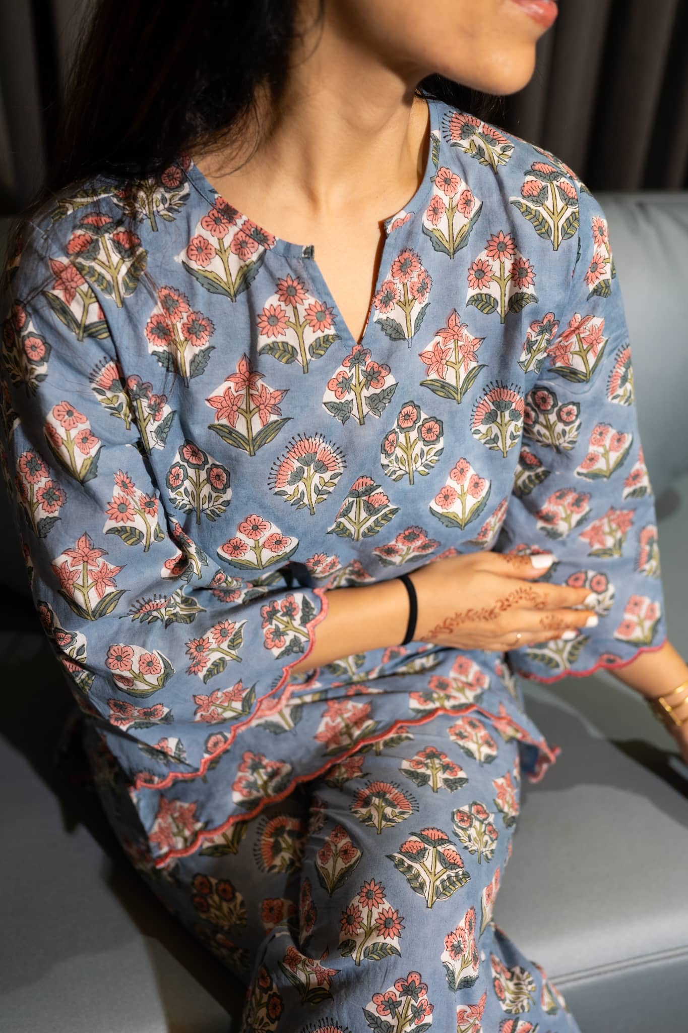Bed, brunch, baggage claim, this co-ord set got every vibe covered. It is crafted with scalloped embroidery on the flared sleeves, kurta edges, and pant hems. With a relaxed fit, a modern notch neckline, and ankle-length or cropped pants, it’s perfect for at-home days, errands, or travelling.